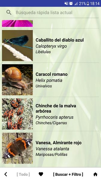 Búsqueda de texto por nombre, nombre científico y grupo en la lista