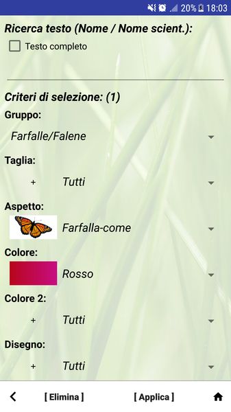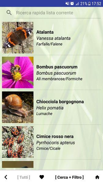 Ricerca testuale per nome, nome scientifico e gruppo nell'elenco